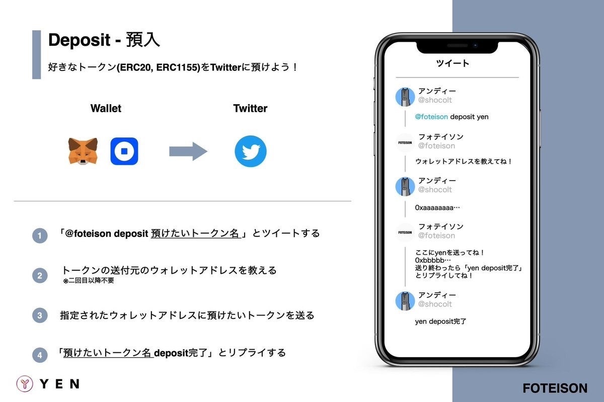 ・「@foteison deposit [トークン名]」とツイートし、ご自身のウォレットアドレスを紐付けた後、指定の運営ウォレットにトークンを送ることで、トークンの預け入れが可能です。