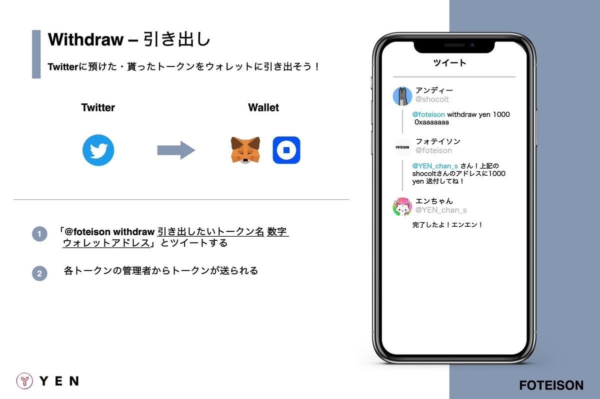 ・「@foteison withdraw [トークン名] [数字] [ウォレットアドレス]」とツイートすると、運営からトークンが指定のウォレットに送付されます。