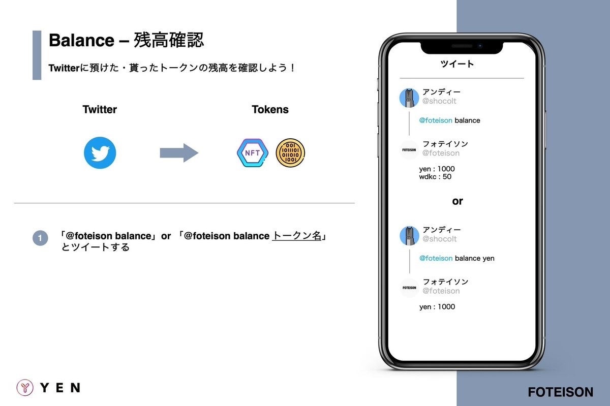 ・「@foteison balance」とツイートすると、ご自身の保有するトークンを確認できます。