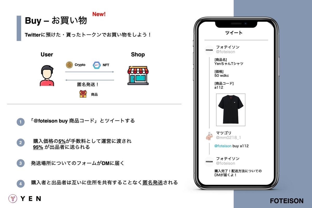 今回のサービスのリリースにより、YENの公式グッズを購入する際、YENのTip機能のうち「Buy」のコマンドを入力することで、Twitter上で簡単にYENでの決済を行うことが出来るようになりました。