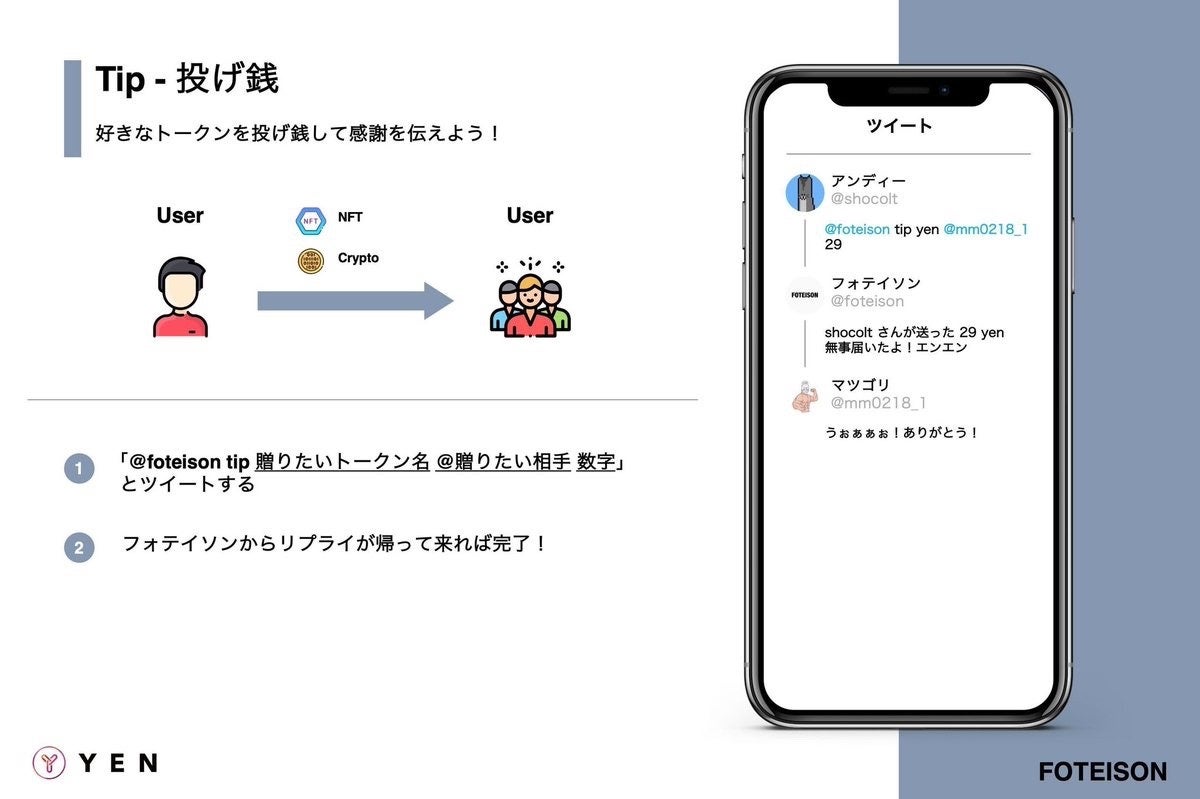 - 日本円連動ステーブルコイン「YEN」の発行を行うYEN株式会社 (本社:東京都文京区) は、Twitter上でYENの投げ銭・決済が可能なTip Bot サービスを開始致しました。これにより、YENのユーザー様は、ブロックチェーン外(オフチェーン上)で、YENの送金やYEN公式グッズの購入が気軽にできるようになります。当サービスの運用を通じて、YENをご利用頂くユーザー間でのコミュニケーションの活性化や、YENの決済手段としての利便性の向上、ひいては「次世代の金融インフラの構築」を目指します。