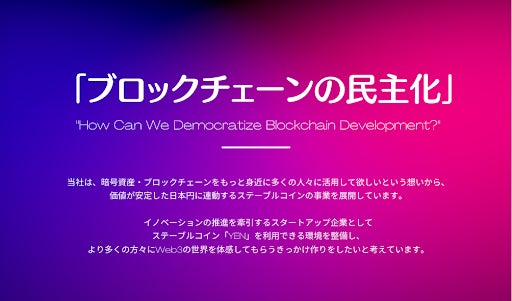 当社は、暗号資産・ブロックチェーンをもっと身近に多くの人々に活用して欲しいという想いで、価値が安定した日本円に連動するステーブルコインの事業を展開しています。これにより、これまで暗号資産を利用したことのなかった多くの方々に対して、ブロックチェーンに触れる機会を提供して参りました。